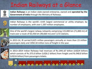 Indian Railways is a state-owned enterprise that is one of the largest commercial employers in the world. In 2013-2014, it had revenues of over $24 billion and carried over 23 million passengers daily and over 1 billion tons of freight annually using its extensive network of over 115,000 km of track. Mumbai Local and metro rail systems provide high-speed connectivity within cities, while the Gatimaan Express and future bullet trains are working to increase intercity speeds in India.