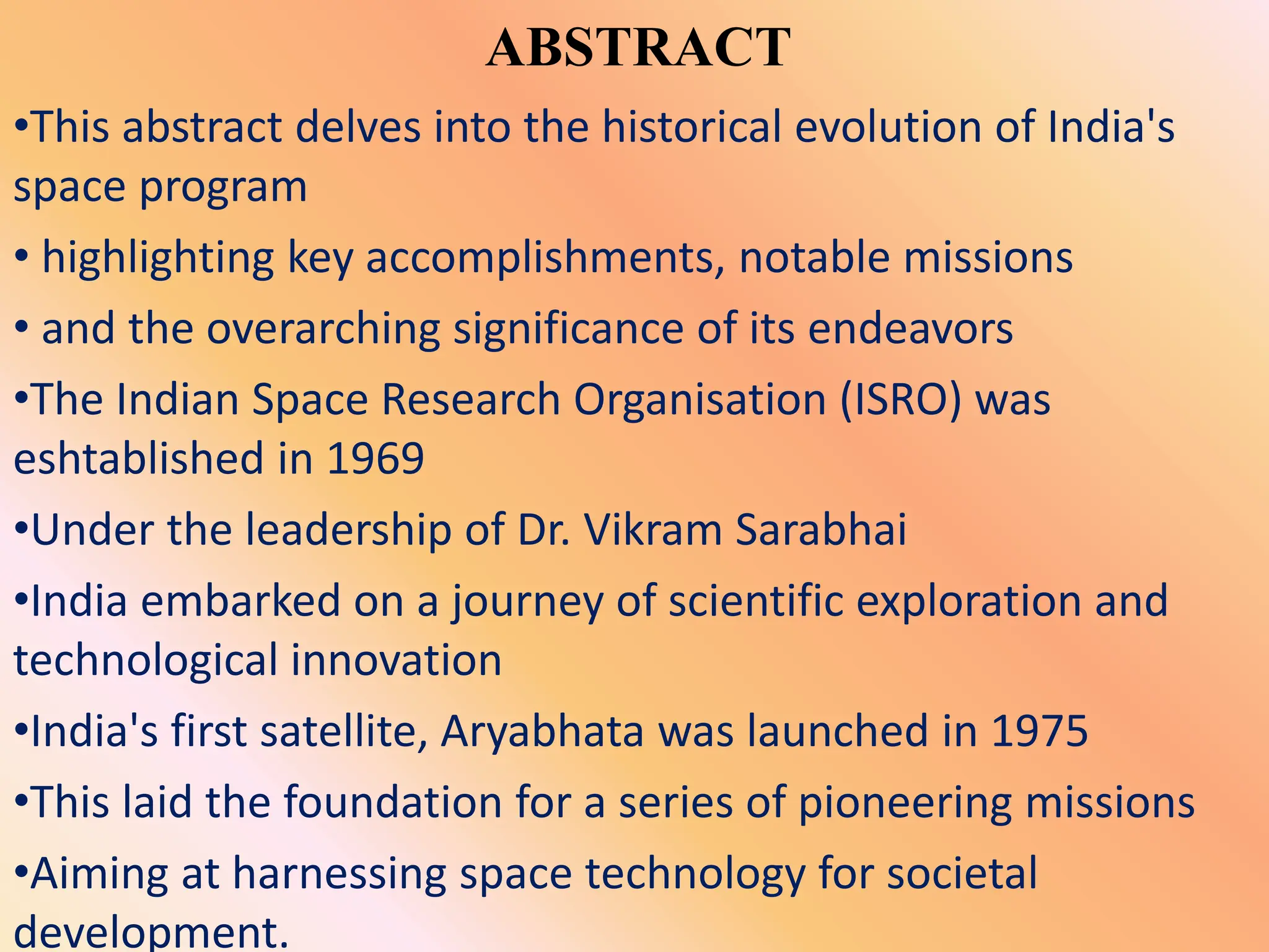 This document summarizes the history and accomplishments of India's space program. It discusses how the Indian Space Research Organisation (ISRO) was established in 1969 under Dr. Vikram Sarabhai to embark on India's journey to explore and utilize space technology. Key events mentioned include the launch of India's first satellite Aryabhata in 1975 and the successful Moon and Mars missions in the 21st century. The applications of India's space program have been wide-ranging, from communication and navigation satellites to earth observation and scientific research. While the program has driven technological advancement and socio-economic development, some argue it comes at high financial costs and India's reliance on foreign technology.