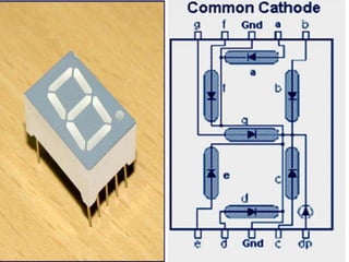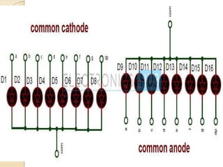 The circuit uses an AT89C51 microcontroller to control LEDs connected to its ports. The AT89C51 is an 8-bit microcontroller with 4KB of flash memory and 128 bytes of RAM. LEDs are connected to port P0 and turned on/off by the microcontroller setting the port pin high or low. Resistors are used to limit current flowing to the LEDs from the microcontroller's 5V output. Seven segment displays can also be interfaced by connecting segments to a port and driving each digit's pattern to display numbers.