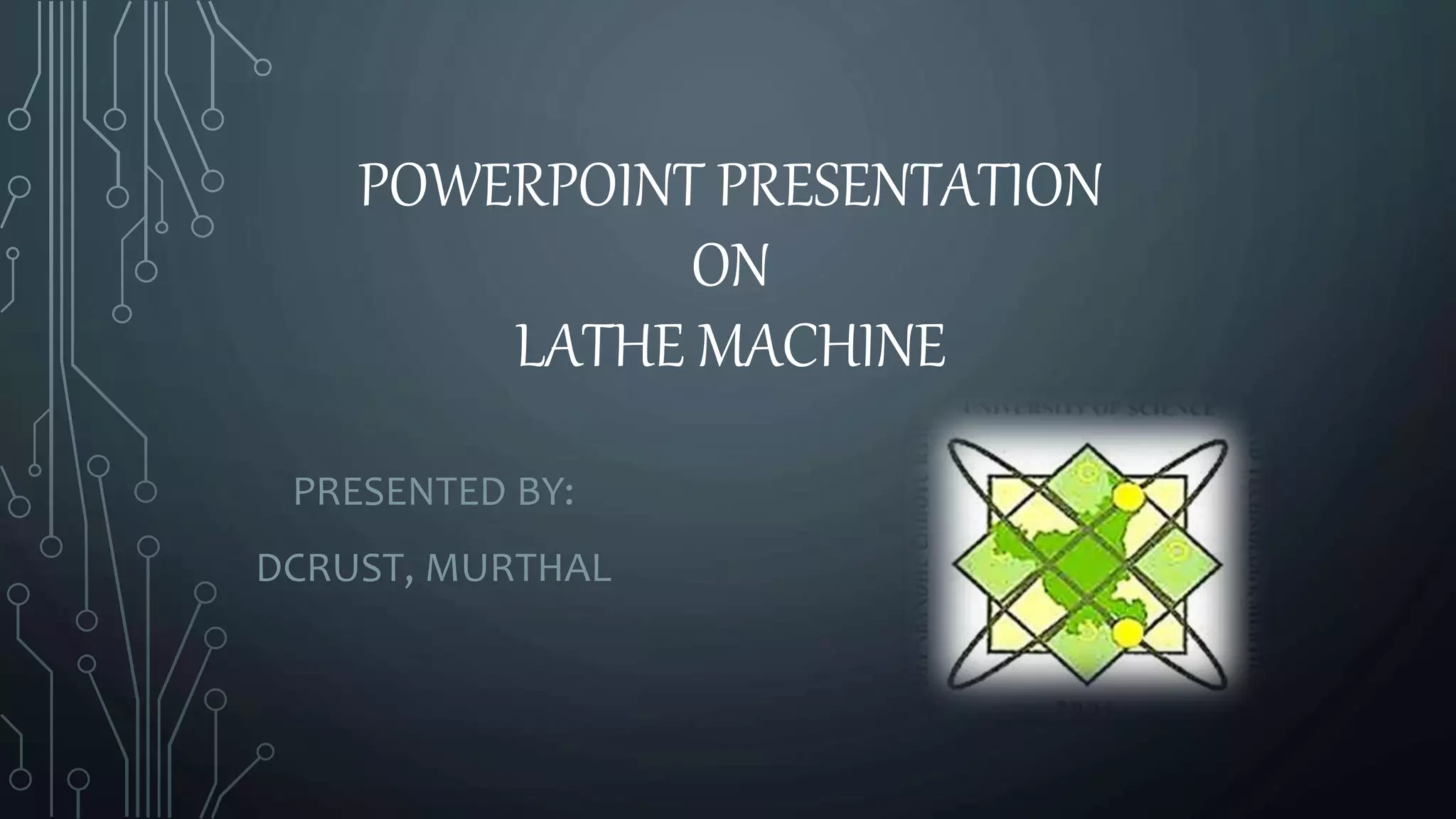 A lathe machine is used to shape materials like metal, wood, glass, and pottery by rotating the workpiece about an axis. It holds the workpiece firmly between centers or in a chuck while a cutting tool is fed into the rotating workpiece. The key components of a lathe include the bed, headstock, gear box, carriage, and tailstock. The headstock houses the spindle that rotates the workpiece while the gear box contains different sized gears to control the spindle speed.