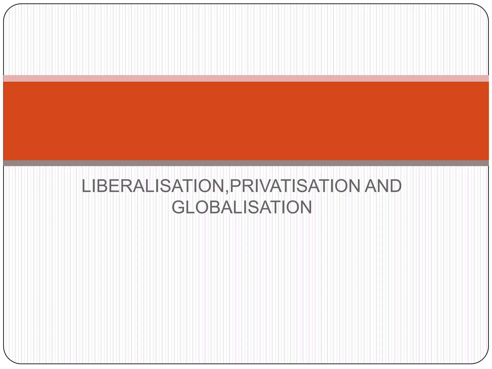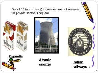 The document discusses India adopting the policy of liberalization, privatization and globalization (LPG) in 1991 to reform its economy. It introduced 3 key changes: 1) Liberalizing trade and industry, removing licenses and tariffs. 2) Extending privatization of public sector companies. 3) Globalizing the economy by opening it to foreign investments and trade. The reasons for LPG were issues like high government debt, inefficiencies, and losses in public sector firms. Liberalization deregulated industry and trade. Privatization sold public companies to private owners. Globalization integrated India's economy globally through foreign investments and trade. The goal of LPG was to make India's economy more efficient and competitive through market-oriented