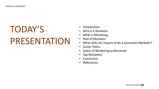 The document provides a comprehensive overview of a career in marketing, defining the role of marketers and the skills required for success. It discusses various career paths within marketing, average salaries for different marketing positions in India, and highlights notable marketers such as Steve Jobs and Gary Vaynerchuk. Marketing is portrayed as an essential function that connects products with customers through research, strategy, and creativity.