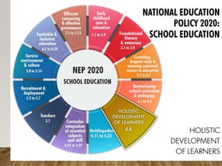 The document summarizes key aspects of the National Education Policy 2020 approved by the Union Cabinet of India. It outlines the vision to transform India's education system by 2040 through a new 5+3+3+4 curriculum structure for school education, increased focus on foundational literacy and numeracy, experiential learning, flexibility in subject choices, and reduced emphasis on board exams. For higher education, it proposes a liberal education system with multiple entry/exit options, greater autonomy of colleges, common entrance exams through NTA, and establishment of the Higher Education Commission of India and National Research Foundation to oversee the sector.