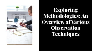 The document discusses various observation techniques used in research. It describes participant and non-participant observation, structured and unstructured observation, disguised and undisguised observation, observation in natural and laboratory settings, direct and indirect observation, and human and mechanical observation. The conclusion emphasizes that observation is an important part of research and it is critical to select the appropriate technique based on the research question and to accurately collect and analyze the data.