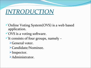 The document outlines the features and architecture of an online voting system (OVS) developed by a team named Badmas Group number 5. It includes detailed descriptions of user roles such as voters, nominees, inspectors, and administrators, along with security measures like authentication and user reporting. The system aims to provide secure, accessible, and efficient voting processes through web-based technology.