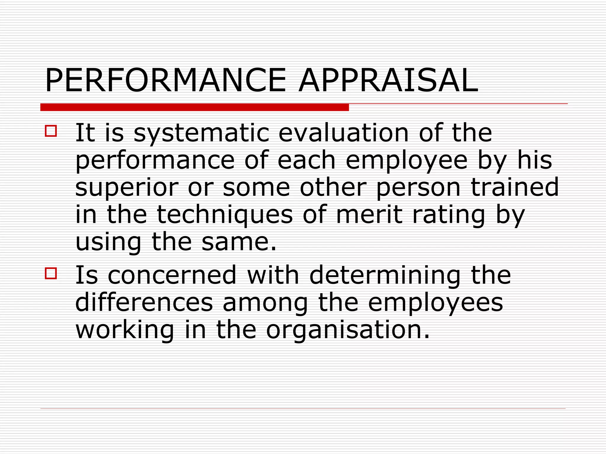 The document discusses performance appraisal, which is the systematic evaluation of an employee's job performance by a supervisor. Performance appraisals are used to understand employees' abilities and contributions, identify training needs, and make personnel decisions. They involve rating employees on criteria like quality, quantity, and timeliness of work. Effective performance appraisals include setting objectives, defining standards, designing the evaluation process, implementing evaluations, providing feedback, and taking follow-up actions to improve performance.