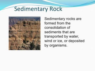 Rocks are naturally occurring solid aggregates of minerals or mineraloids. There are three main types of rocks: igneous, sedimentary, and metamorphic. Igneous rocks form from cooling magma either underground (plutonic) or on the surface (volcanic). Sedimentary rocks form from the compaction and cementation of fragments. Metamorphic rocks form from changes to existing igneous and sedimentary rocks through heat and pressure. The rock cycle describes the interrelationships between these three rock types through geological processes like weathering, erosion, deposition, and metamorphism.