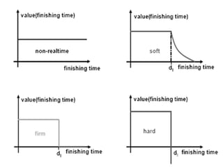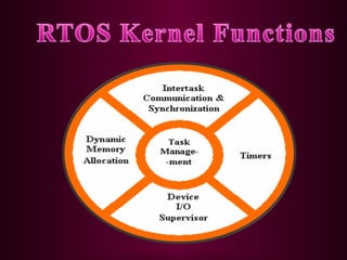 The presentation on real-time operating systems (RTOS) covers definitions, types, kernel functions, and applications in various fields. Key features include priority-based preemptive scheduling, where tasks with higher priority are executed first, and the role of dynamic memory allocation in inter-task communication. RTOS are utilized in diverse systems such as automotive controls, flight systems, and telecommunications, with future designs incorporating field programmable gate arrays for enhanced performance.