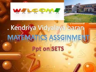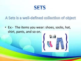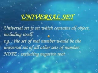 The document discusses different ways to represent sets including roster or tabular form, set-builder form, and using a universal set represented by a rectangle with subsets represented by circles. It also defines the intersection of two sets A and B as A∩B, containing elements that are members of both sets. Finally, it defines the difference of two sets A and B as A-B, containing elements that are members of A but not members of B.