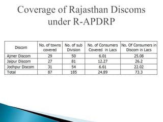 The document discusses the implementation of the Restructured Accelerated Power Development and Reforms Program (R-APDRP) in Rajasthan, India. Key points: