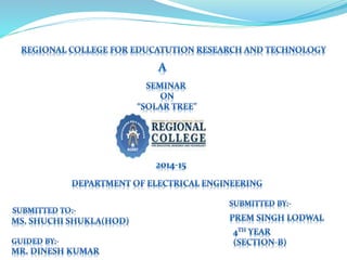 The document discusses solar trees, which are structures that use multiple solar panels arranged like a tree to generate electricity efficiently using less land than traditional solar panel systems. A solar tree works by converting sunlight into electricity through photovoltaic cells on each panel. It has several advantages over standard solar panel installations such as requiring less space while providing environmental and cost benefits to users.