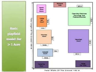 The document discusses the role of the Urban Improvement Trust (UIT) in Kota, India. It was established in 1970 by the government to achieve urban development objectives. The UIT is responsible for the overall development of Kota city, including designing the urban pattern, acquiring land, and planning residential and commercial schemes. It also plans and develops sport facilities in the city, including acquiring land and constructing stadiums. The document then discusses considerations for stadium site selection and design, including the functional requirements and design of sports fields for activities like cricket.