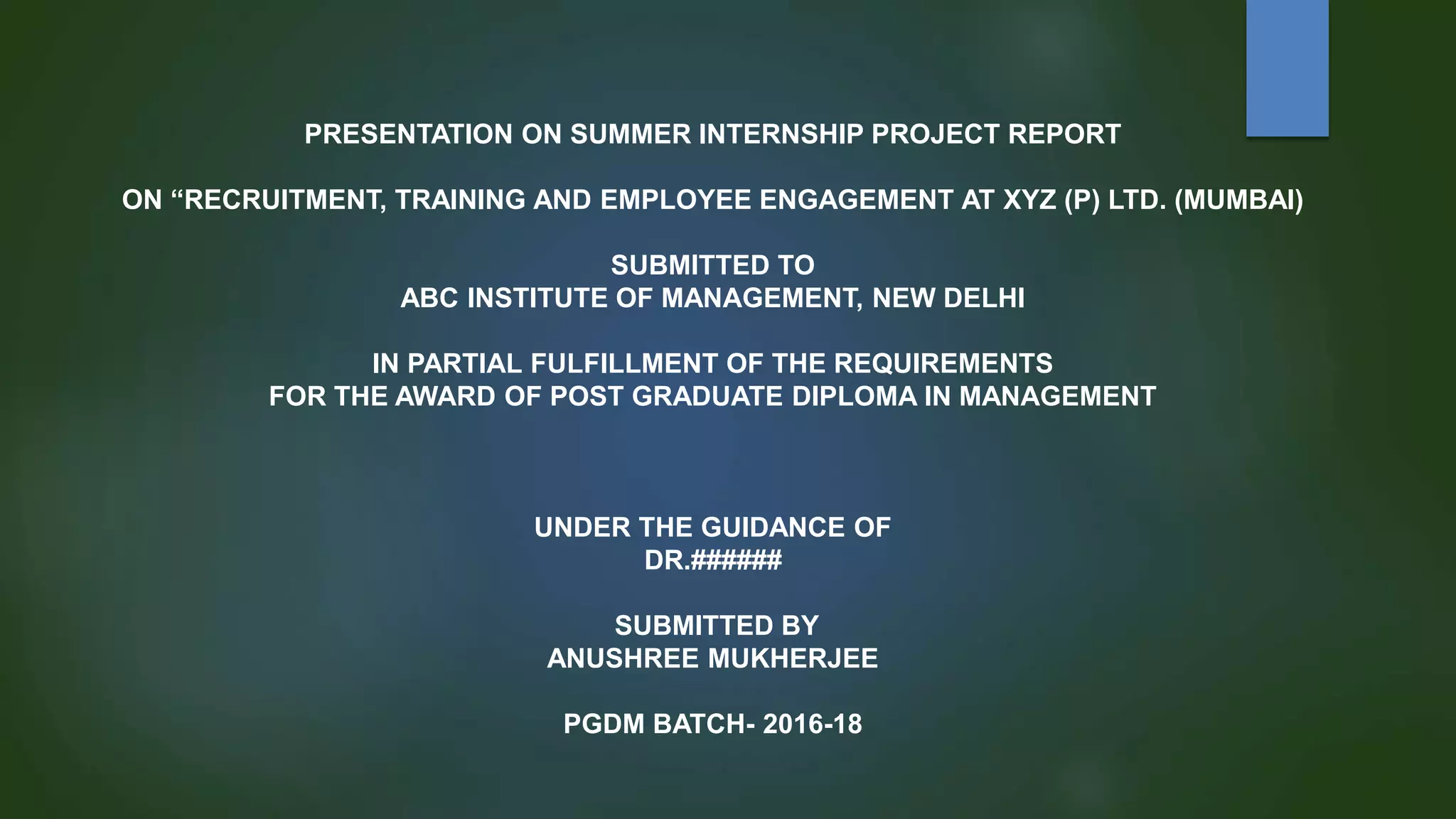The document presents a summer internship project report on recruitment, training, and employee engagement at XYZ (P) Ltd. in Mumbai. The report includes an overview of the company, objectives of studying its HR policies, methodology used, findings on recruitment, training, and engagement policies, learning outcomes, and recommendations. Key findings include that the company sources candidates through job portals and has training plans to address skill gaps for new and existing workers. Engagement activities like weekly fun activities and an annual sports event help build relationships between management and employees. Recommendations include increasing gender diversity and streamlining the recruitment process.