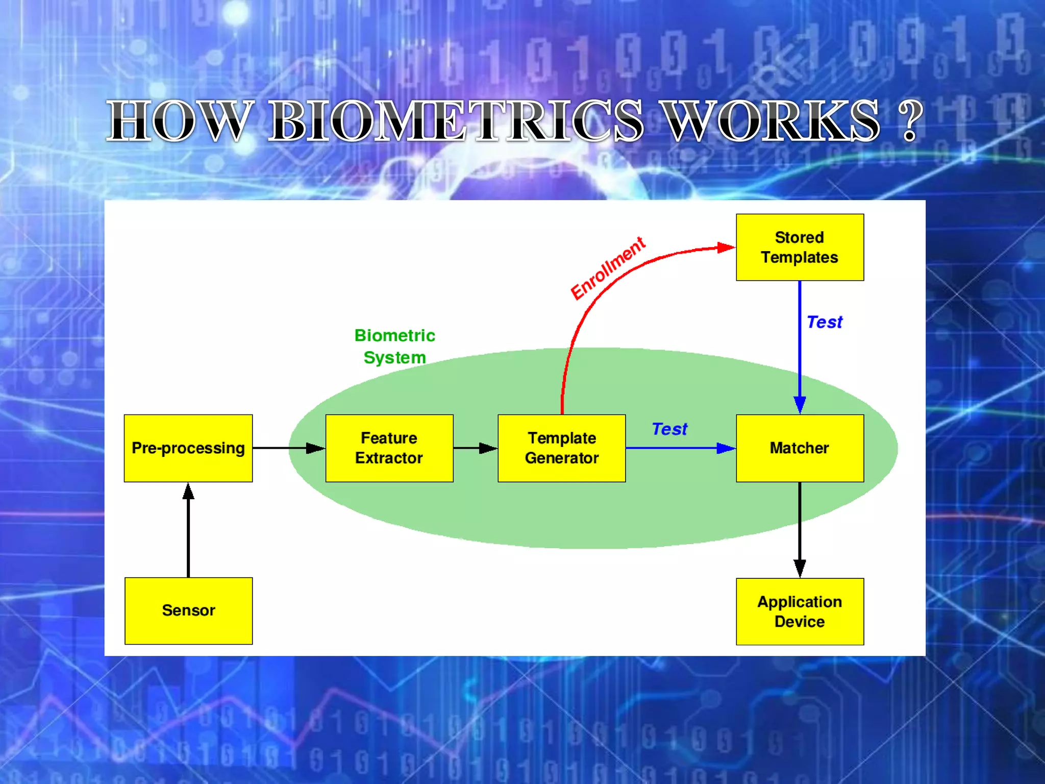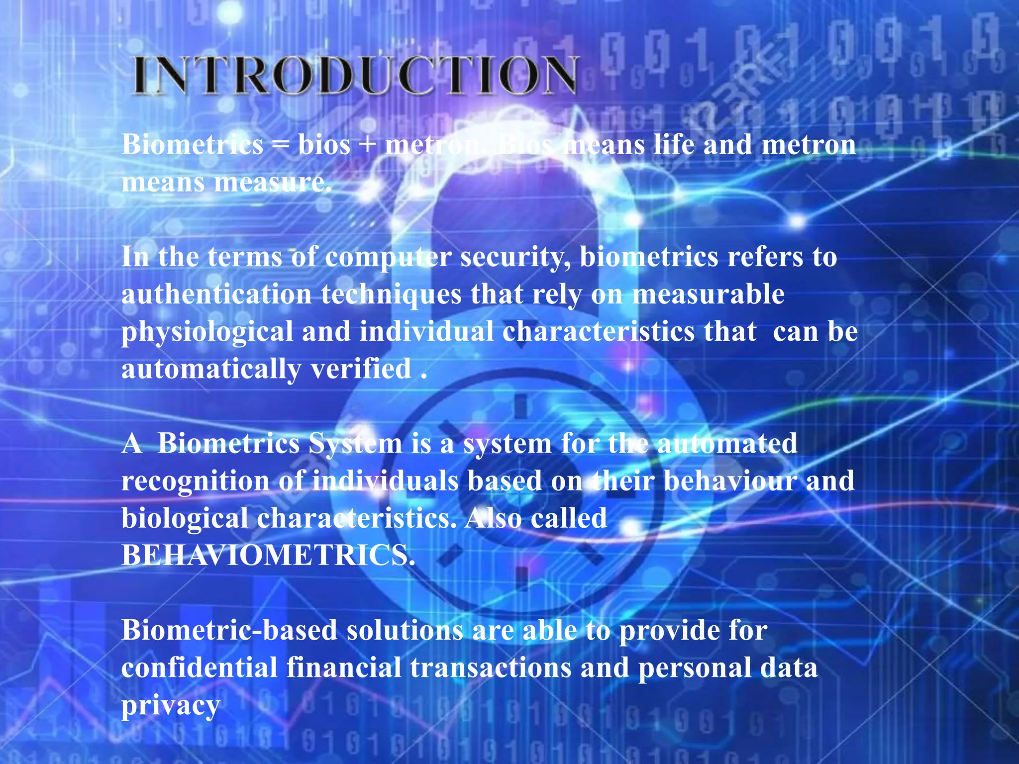 Biometrics refers to authentication techniques that rely on measurable physiological and individual characteristics to automatically verify identity. There are two main types of biometrics: physiological, which relate to the body shape like fingerprints, retina, and face; and behavioral, which relate to behaviors like voice, handwriting, and typing patterns. Biometric systems use verification to compare a sample to a single stored template or identification to search a sample against a database of templates to resolve a person's identity. While biometrics can provide strong authentication for applications like secure banking, border control, and access control, they are not perfect and have limitations like cost, accuracy, and privacy concerns.