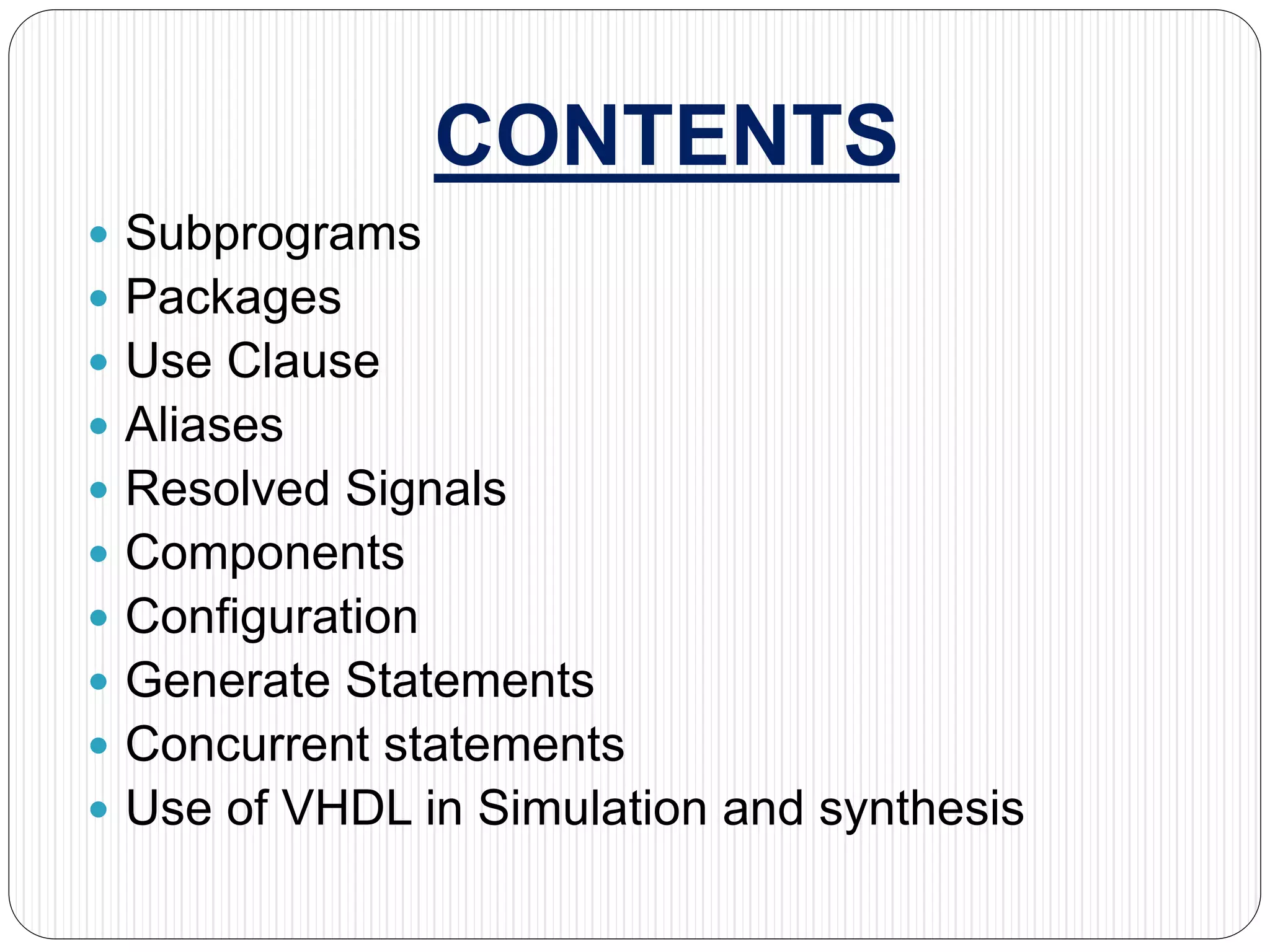 The document details various aspects of VHDL, focusing on subprograms, packages, and their functionalities, including procedures and functions for code reuse. It explains how to declare and use packages, types, aliases, resolved signals, components, configurations, and concurrent statements. Additionally, it highlights the roles of simulation and synthesis in VHDL design, particularly with tools like the Aldec simulator and synthesis tools.