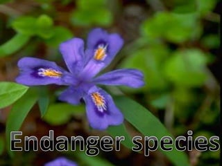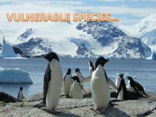 The document discusses species that are vulnerable, endangered, and rare. Vulnerable species are at risk of becoming endangered due to habitat loss or destruction. Endangered species are categorized by the IUCN as likely to become extinct. There are currently 3079 endangered animal species and 2655 endangered plant species worldwide, up from 1998 levels. Rare species refer to organisms that are uncommon or infrequently encountered.
