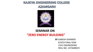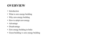 The document summarizes a seminar on zero energy buildings. It defines a zero energy building as one with zero net energy consumption annually, as the energy used is equal to that generated on-site by renewable sources. It describes how to achieve zero energy status through site selection, reducing energy loads via design, and employing renewable energy sources like solar panels and wind turbines. Examples of zero energy buildings in India are highlighted, including the largest rooftop solar installation on a multi-story building. A zero energy building is considered more sustainable than a general green building as it aims to fully offset energy usage and emissions.