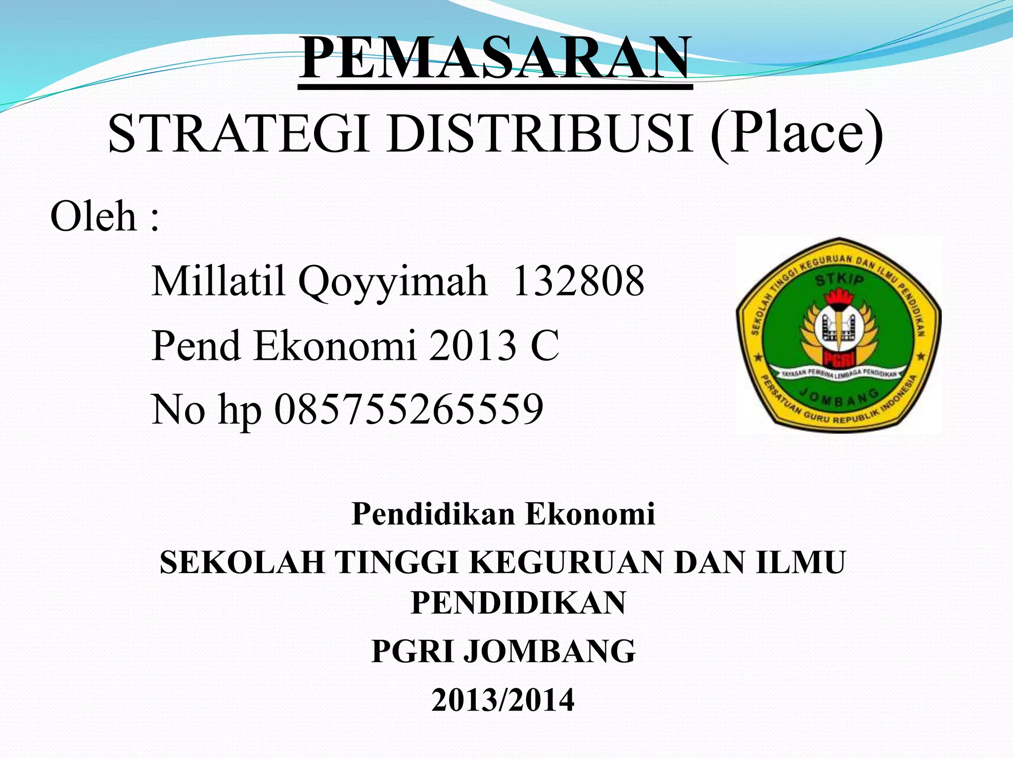Dokumen tersebut membahas tentang strategi distribusi (place) dalam pemasaran. Terdapat beberapa poin penting yaitu: 1) Jenis-jenis distributor seperti agen, penyalur, distributor; 2) Jenis-jenis saluran distribusi seperti langsung dan tidak langsung; 3) Tujuan saluran distribusi seperti melayani konsumen dengan cepat dan menghemat biaya.