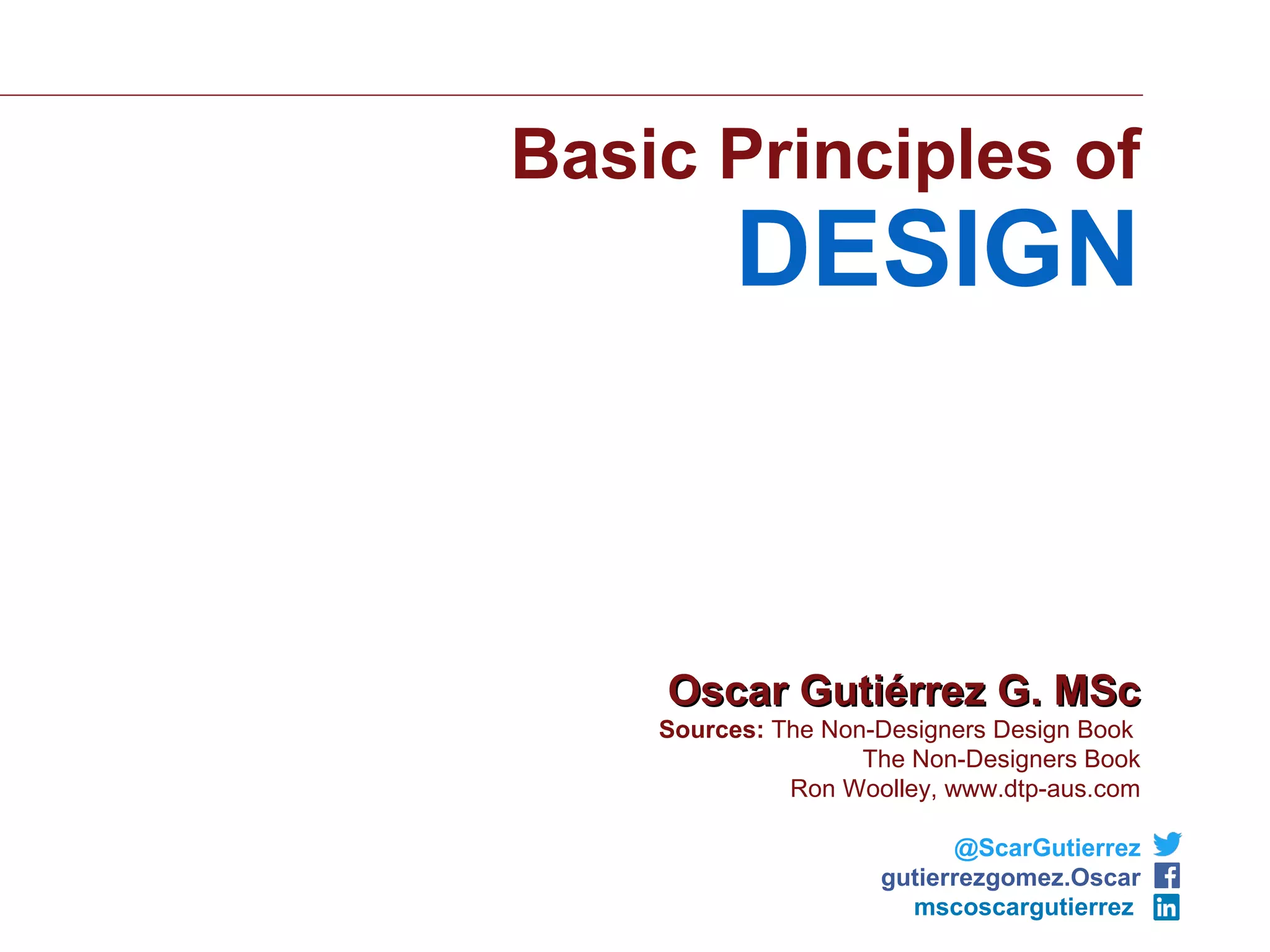 The document discusses the basic principles of design, including alignment, proximity, repetition, and contrast. It provides examples and guidelines for applying each principle. The four principles give structure and organization to layouts, group related information together, tie different parts together through consistency, and create emphasis and visual interest. The document also provides tips for effective use of type, color, buttons, navigation, and avoiding common design mistakes. The overarching goal of design is clear communication.