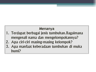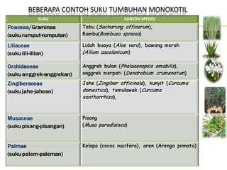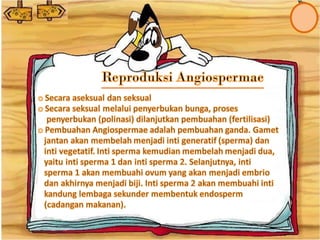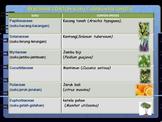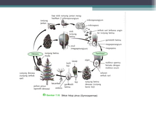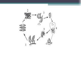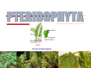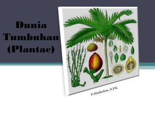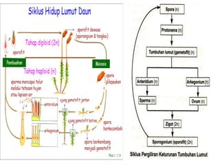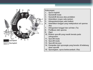 Dokumen ini menjelaskan tentang klasifikasi dan ciri-ciri tumbuhan, khususnya lumut dan paku, serta perbedaan antara keduanya. Tumbuhan lumut memiliki karakteristik seperti belum memiliki jaringan pengangkut dan dominasi generasi gametofit, sementara tumbuhan paku memiliki akar, batang, dan daun sejati dengan fase sporofit yang lebih dominan. Selain itu, dokumen ini juga mencakup manfaat dan reproduksi dari tumbuhan tersebut.