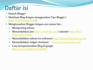 Dokumen tersebut memberikan instruksi lengkap untuk membuat blog menggunakan Blogger, termasuk cara memposting tulisan, menambahkan jam/kalender, gambar animasi, penerjemah Google, dan mempromosikan blog di Google.