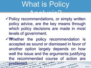 This document discusses ethical policy analysis. It provides guidance on defining problems, establishing goals, selecting and implementing policies, and evaluating policies. It emphasizes defining problems clearly, considering various stakeholder interests and values, gathering relevant evidence, constructing alternative solutions, and selecting criteria to evaluate alternatives. The document also discusses five ethical principles for policy analysts: integrity, competence, respect, responsibility, and concern. It provides direction on applying these principles throughout the policy analysis process.