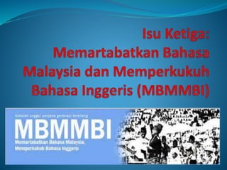 Dokumen ini membincangkan kepentingan penggunaan bahasa ibunda dalam pendidikan di Malaysia serta isu yang berkaitan dengan dasar Pengajaran dan Pembelajaran Sains dan Matematik dalam Bahasa Inggeris (PPSMI). Kebaikan penggunaan bahasa ibunda termasuk meningkatkan kefahaman pelajar, sementara PPSMI dikritik kerana menurunkan prestasi akademik pelajar. Dasar baru Memartabatkan Bahasa Malaysia dan Memperkukuhkan Bahasa Inggeris (MBMMBI) diperkenalkan untuk mengatasi kelemahan tersebut dan memajukan penguasaan bahasa di kalangan pelajar.