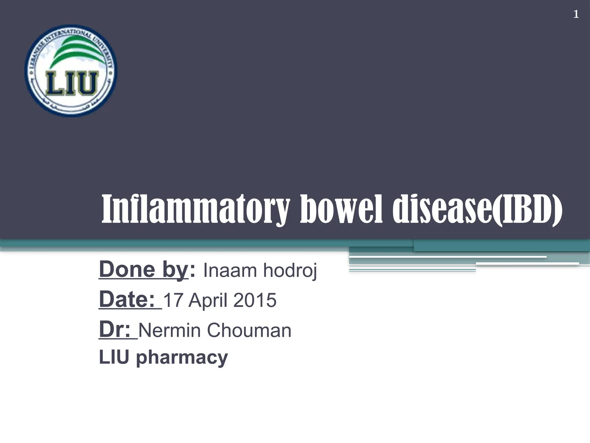 Inflammatory bowel disease (IBD) includes ulcerative colitis (UC) and Crohn's disease (CD), affecting different regions of the gastrointestinal tract with varying symptoms and complications. Diagnosis involves clinical presentation, stool examination, and imaging, while treatment options range from nutritional support to pharmacological therapies and surgery, depending on severity. Recent studies highlight the efficacy of new delivery systems for 5-ASA in achieving clinical remission in left-sided colitis.