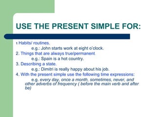 The document provides information on the present simple and present continuous tenses in English. It discusses when to use each tense, including habits/routines for the present simple and ongoing actions for the present continuous. It also covers formation of the present continuous, pronunciation of the -s ending in the third person singular, and the distinction between action and non-action verbs. Examples are provided throughout to illustrate the different uses of these tenses.