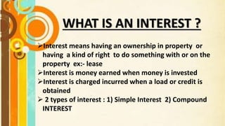 2) Compound interest is calculated on the initial principal as well as accumulated interest from previous periods. It uses the formula Interest = Principal x (1+Rate)^Time - Principal.
