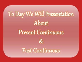 This document provides information about the present continuous and past continuous tenses in English. It defines the present continuous tense as expressing an act that is happening at the time discussed. It gives the formula and examples for positive, negative, and interrogative sentences in the present continuous. It then discusses the past continuous tense, providing its formula using was/were and the -ing form of verbs. It gives examples of using the past continuous tense to indicate actions occurring during a particular past moment or to show the interruption of one ongoing action by another brief action.