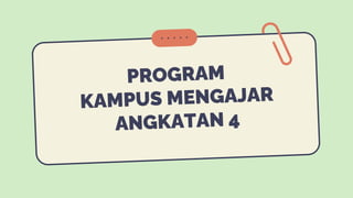 Kampus Merdeka adalah bagian dari kebijakan Merdeka Belajar di Indonesia yang memungkinkan mahasiswa mengembangkan kemampuan melalui pengalaman kerja nyata. Program Kampus Mengajar membantu mahasiswa dalam meningkatkan kompetensi literasi dan numerasi di sekolah, serta memperkenalkan teknologi dalam pembelajaran. Kebijakan ini bertujuan untuk menciptakan sumber daya manusia yang unggul dan adaptif terhadap era digital.