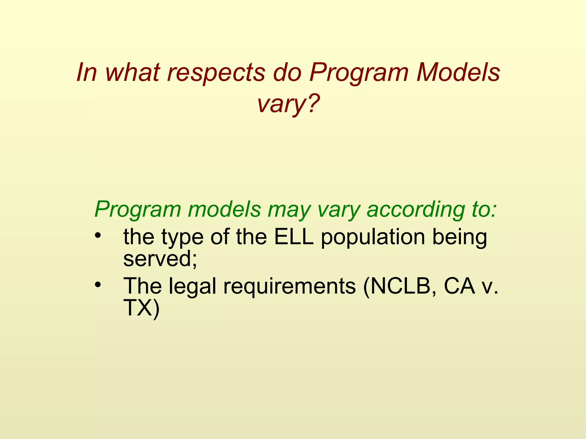This document discusses different models for bilingual education and English as a second language programs. It summarizes the goals and key features of different program models including transitional bilingual programs, dual bilingual programs (one-way and two-way), ESL pull-out, ESL self-contained, sheltered English/content-based ESL, and legal requirements for bilingual education in Texas. The models vary based on factors like the student population, use of native language, inclusion of English speakers, and duration of the program.