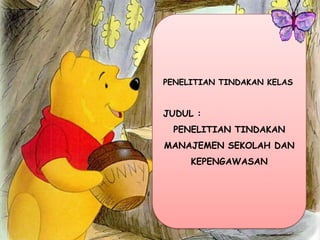 Dokumen ini membahas tentang penelitian tindakan manajemen sekolah dan pengawasan. Penelitian tindakan manajemen sekolah dilakukan oleh kepala sekolah untuk meningkatkan lima dimensi kompetensi yang disyaratkan, sementara penelitian tindakan pengawasan bertujuan meningkatkan enam dimensi kompetensi pengawas sekolah. Tema penelitian tindakan dapat berfokus pada kegiatan memantau,