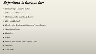 Rajasthan, known as 'a land of kings,' is celebrated for its rich heritage and colorful culture, featuring folk music, dance, historical forts, and traditional cuisine. The state boasts famous cities such as Udaipur and Jaipur, each known for unique attractions like lakes and forts, alongside notable festivals. Additionally, Rajasthan is rich in minerals and offers a variety of activities, including desert safaris, wildlife tours, and exploring its diverse crafts.