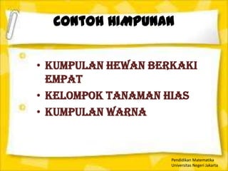 Dokumen ini membahas tentang konsep himpunan dalam matematika serta memberikan contoh kelompok hewan dan tanaman. Selain itu, terdapat panduan untuk mengisi tabel mengenai nama dan golongan darah teman serta cara menunjukkan relasi antara himpunan dengan diagram panah dan pasangan berurutan. Kesimpulan menyebutkan relasi antara nama anak dan permainan yang mereka gemari.