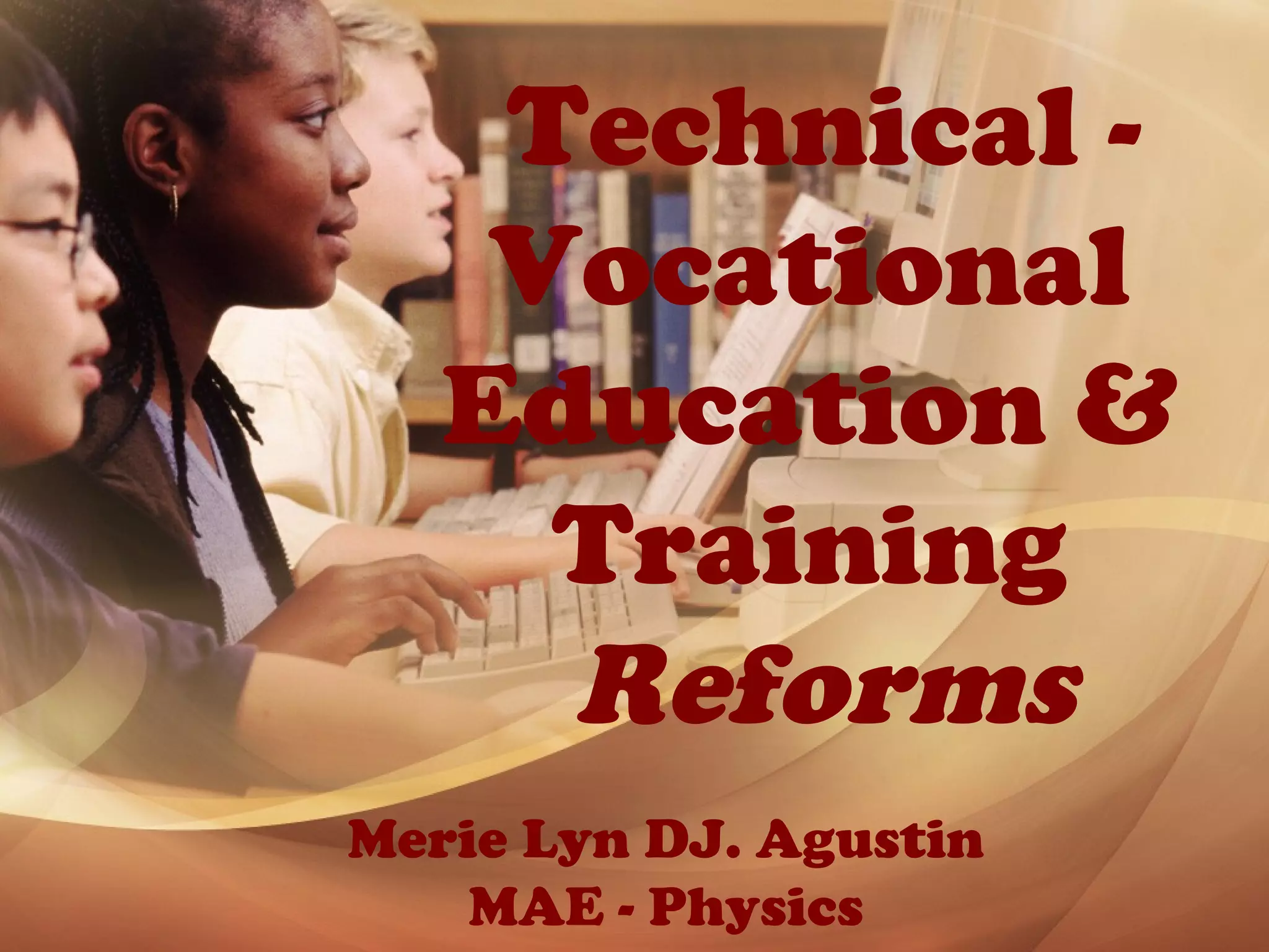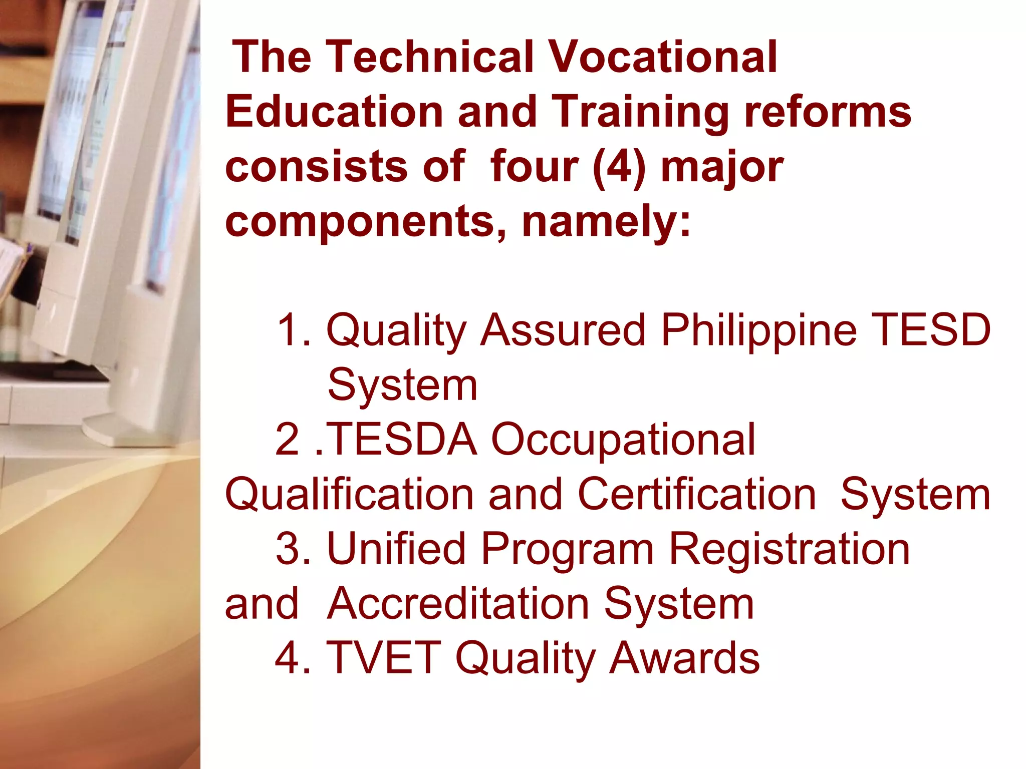 The document outlines the comprehensive framework for Technical Vocational Education and Training (TVET) reforms in the Philippines, consisting of quality assurance systems, qualification standards, and unified registration processes. It emphasizes the importance of a relevant, efficient, and accessible education system aimed at satisfying industry needs and improving workforce competitiveness. Additionally, it introduces collaboration with international partners, such as Germany, to enhance TVET capabilities and incorporates these developments into the K to 12 education curriculum.