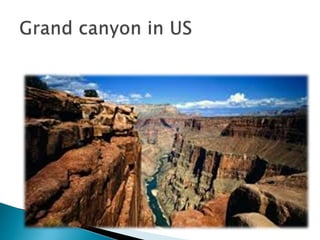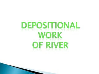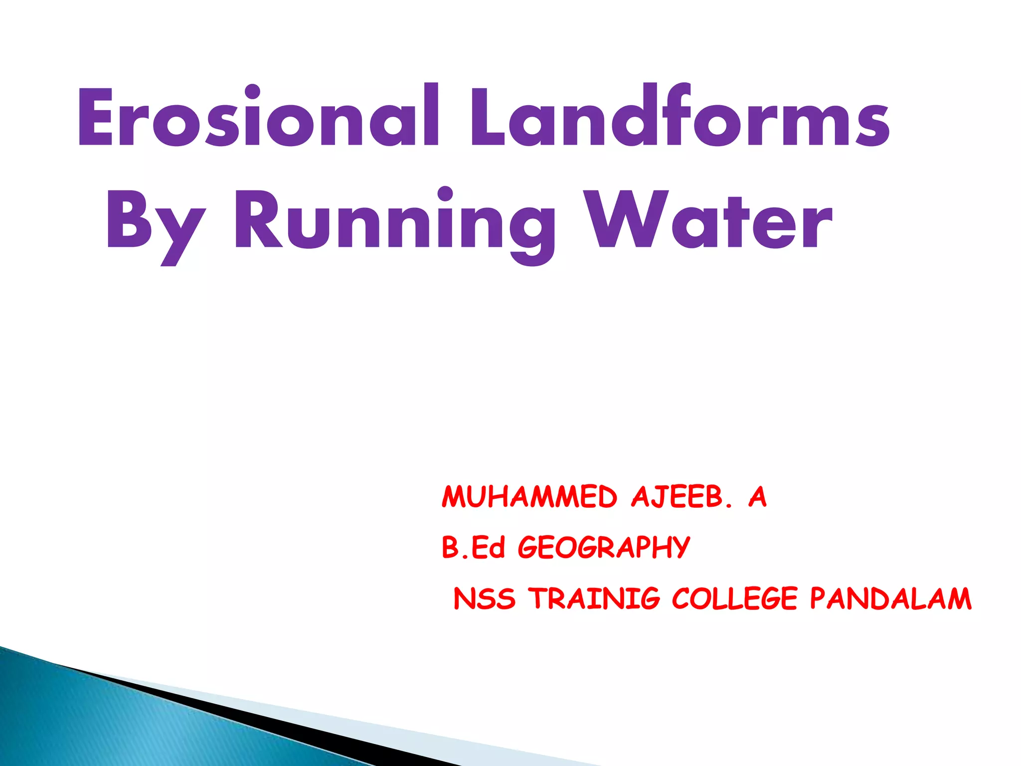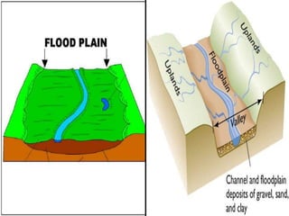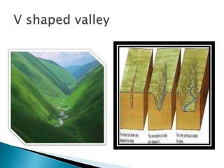 This document discusses various landforms created by erosion from running water, including valleys, canyons, waterfalls, flood plains, meanders, ox-bow lakes, and deltas. Valleys form from faster downcutting than lateral cutting by rivers. Canyons like the Grand Canyon are very long and narrow valleys formed by the Colorado River's erosive action. Meanders are twists and turns that occur when a river's speed decreases on flood plains.