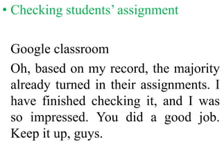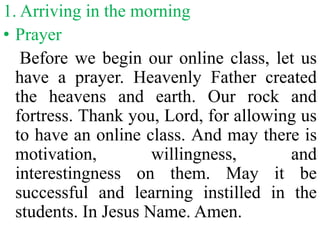1. The document outlines the daily procedures and activities for an online English class. It discusses having a prayer at the beginning, checking assignments, taking attendance, posting reminders for lessons and assignments, checking quizzes throughout the day, and asking questions.