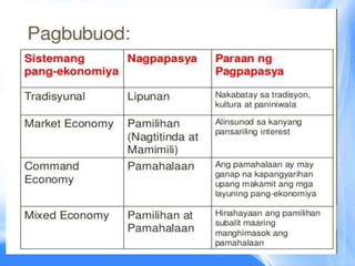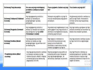 Tinalakay sa dokumento ang mga sistema ng alokasyon ng pinagkukunang yaman na nagsisilbing solusyon sa mga suliranin ng kakapusan. Ipinakita ang tatlong paraan ng epektibong paggamit ng mga yaman: konserbasyon, pamumuhunan, at paggamit ng makabagong teknolohiya. Ipinakilala rin ang iba't ibang uri ng sistemang pang-ekonomiya tulad ng tradisyonal, market, at command na ekonomiya, pati na rin ang mga konseptong sosyalismo at kapitalismo.