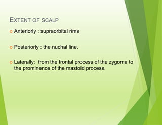 The document discusses scalp anatomy and reconstruction of scalp defects using flap procedures. It describes the layers of the scalp, blood supply, nerve supply and causes of scalp defects. Various reconstruction options are summarized including primary closure, skin grafting, local flaps such as rotation and transposition flaps, regional flaps such as trapezius flaps, and free tissue transfer including latissimus dorsi flaps. Factors to consider for reconstruction include the location and size of the defect, surrounding tissues, and preservation of the native hairline.