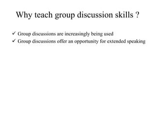 Group discussions are increasingly being used in professional settings and offer opportunities for extended speaking practice. There are different types of discussions including making a discussion based on a given topic or creating something new to solve a problem. Students should develop useful sub-skills for group discussions like analyzing perspectives, persuading others, controlling emotions, and using functional language. When setting up group discussions, teachers should plan time, choose topics, allow brainstorming, ensure a balance of input and practice, vary group sizes and procedures, and use different types of discussions. Feedback should be given through focused questions, recording discussions, monitoring groups, and structuring feedback to help students improve.