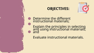 The document outlines the principles and guidelines for selecting and using instructional materials in education. It emphasizes the importance of engaging multiple senses through various media to enhance learning and provides practical criteria for evaluating the suitability and effectiveness of such materials. Key principles include ensuring materials align with instructional objectives and supporting the teacher rather than replacing them.