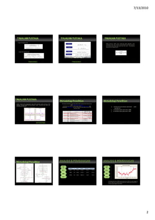 Dokumen ini membahas analisis dampak tanggal ex-dividend terhadap harga saham harian perusahaan perbankan di pasar modal Indonesia selama tahun 2008-2009. Dengan menggunakan pendekatan time series intervensi, penelitian ini bertujuan untuk memodelkan harga saham dan menentukan waktu serta lama pengaruh yang terjadi. Hasil penelitian menunjukkan bahwa ada model ARIMA yang sesuai untuk memprediksi perubahan harga saham terkait dengan tanggal ex-dividend.
