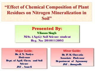 The document discusses the effect of chemical composition of plant residues on nitrogen mineralization in soil. It presents findings from several case studies and research papers. The chemical composition of different plant residues like lignin, polyphenols and C:N ratio affects their decomposition rate and impacts nitrogen mineralization. Plant residues high in nitrogen and low in lignin and polyphenols decompose faster, releasing nitrogen for plant uptake. The studies show crop residues and tree leaves with higher lignin and polyphenol content immobilize soil nitrogen during decomposition.