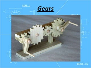 This document provides an overview of gears, including their classification, types, terminology, and applications. It discusses the following: