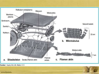 Dokumen tersebut membahas tentang sitoskeleton pada sel eukariota yang terdiri dari tiga komponen utama yaitu mikrofilamen, mikrotubulus, dan filamen intermediat. Mikrofilamen berperan dalam pergerakan sel dan organel, mikrotubulus mengatur posisi organel, sementara filamen intermediat memberikan dukungan pada sel dan inti sel.