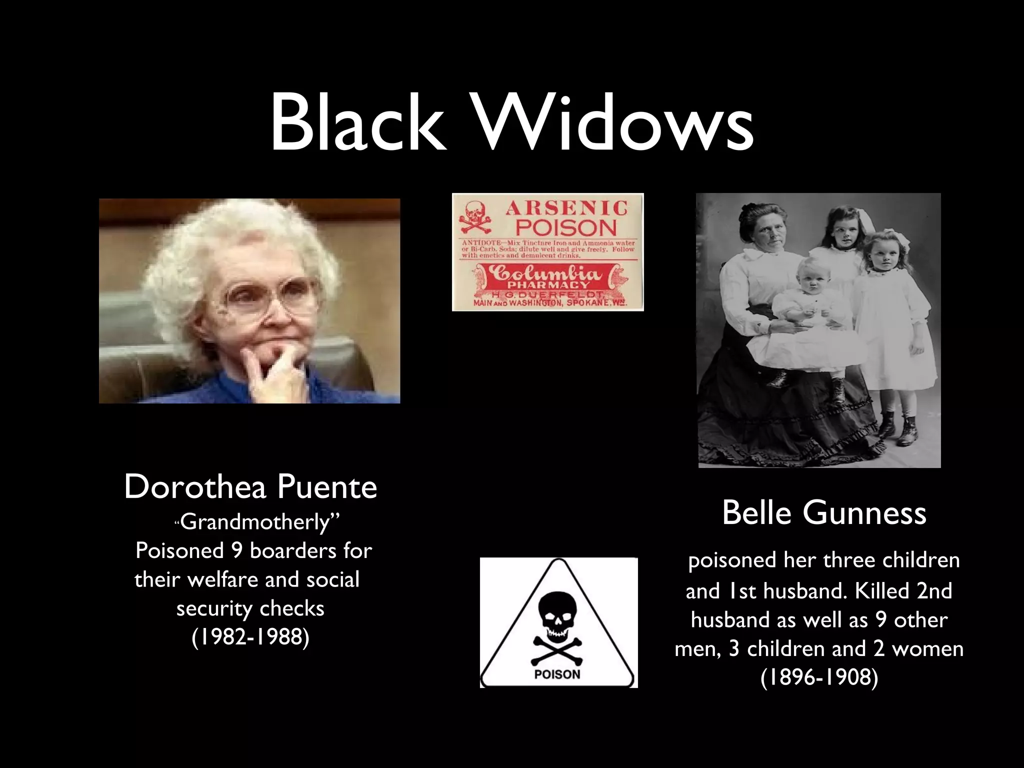 This document summarizes several notorious female serial killers: Belle Gunness poisoned her three children and two husbands in the late 1890s; Dorothea Puente poisoned 9 boarders in the 1980s for their money; Bobbie Sue Terrell drugged at least 12 patients in multiple states; Charmaine and Heather West murdered at least 12 women and two of their own children with Frederick and Rosemary West from 1971-1988; Marie Noe suffocated 10 of her children over 19 years from 1949-1968; Shantaniqua Scott was caught on camera trying to smother her infant son in 2011; and Aileen Wuornos murdered 7 men from 1989-1990.