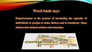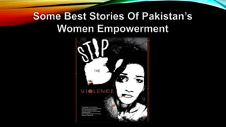 This document discusses women empowerment in Pakistan. It outlines the principles of empowerment, challenges faced by women historically and currently, protections for women under the Pakistani constitution and Islamic teachings. It analyzes Pakistan's poor rankings in measures of women's empowerment and participation. The document concludes by presenting visions and goals for further empowering women in Pakistan through education, employment, decision making power, and ending discrimination.