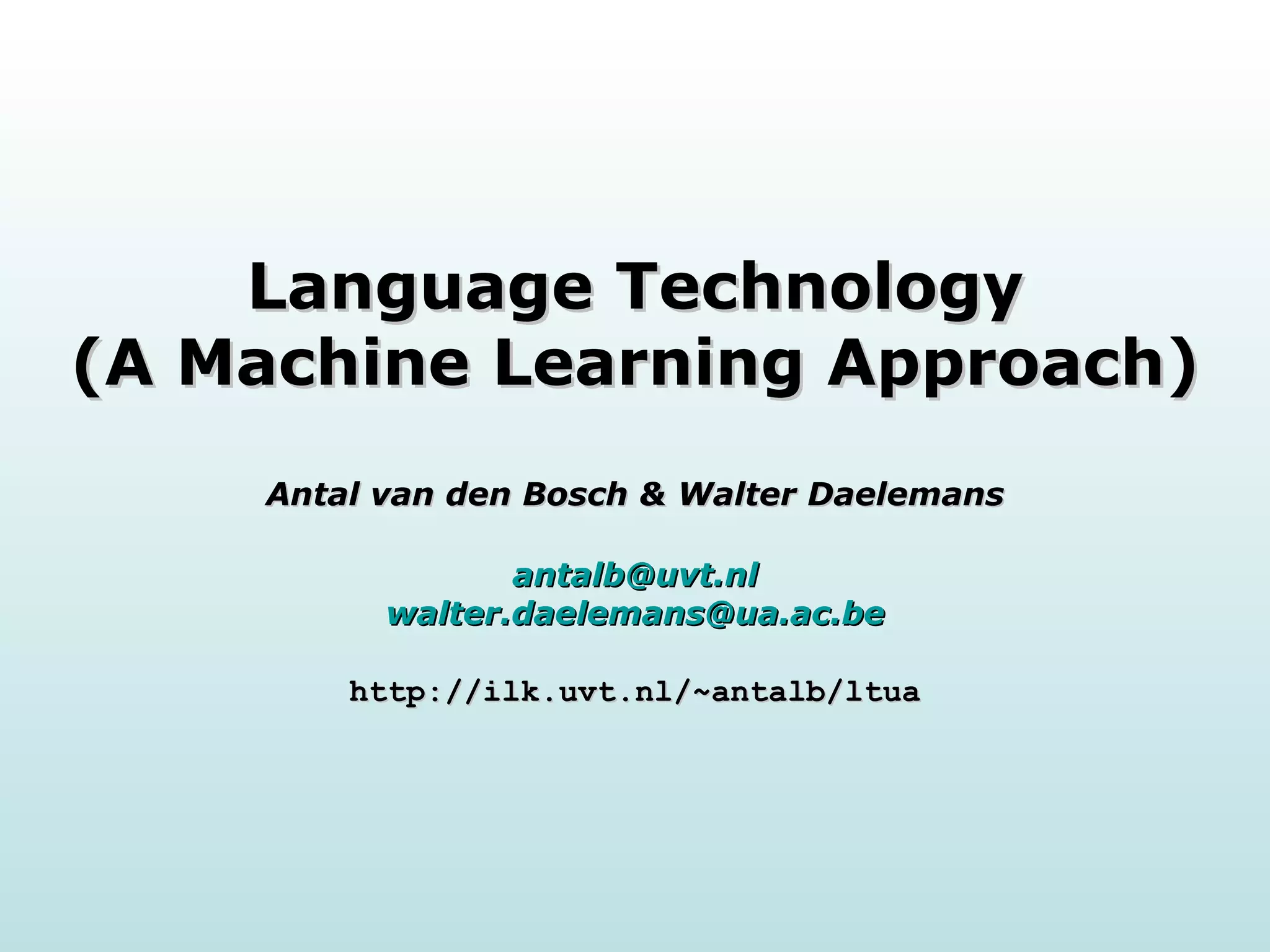 The document discusses machine learning approaches for natural language processing. It provides an overview of various NLP tasks like tagging, parsing, information extraction that can be addressed using machine learning techniques. Both deductive and inductive approaches are described for developing models from linguistic data and applying them to solve problems in language processing and understanding.